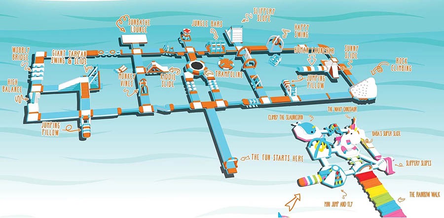 Inflatable Island 佔地超過 3,400 平方米,面積相當於 8 個籃球場,號稱是亞洲最大的水上充氣遊樂場!這裡不僅有刺激的水上滑道、橋樑和彈跳床,更以夢幻的視覺設計聞名。