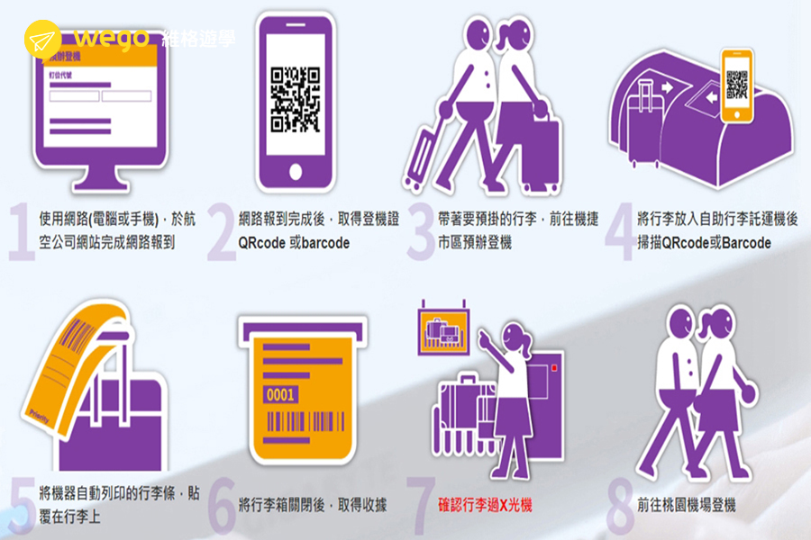 傳統櫃台辦理報到的同學們,在地勤幫你報到的同時就會幫您確認行李數量及重量,所以等於是一氣呵成,只是在排隊上要花比較長的時間! 那如果是網路預先報到或是自助報到的同學們,就可以直接到「自助報到/網路報到」窗口辦理,地勤人員只需掃描二維條碼,鍵入行李數量與確認重量就完成了,地勤也會為您的行李掛上印有唯一碼的行李條,以利後續搬運人員確認你的行李最終目的地。 當托運行李後請帶著您的旅遊證件(登機證及隨身行李護照等等)務必跟著行李確認經過X光機沒問題後再離開,如果行李過X光機有問題會被拖出來,同學要處理完才能離開呦!