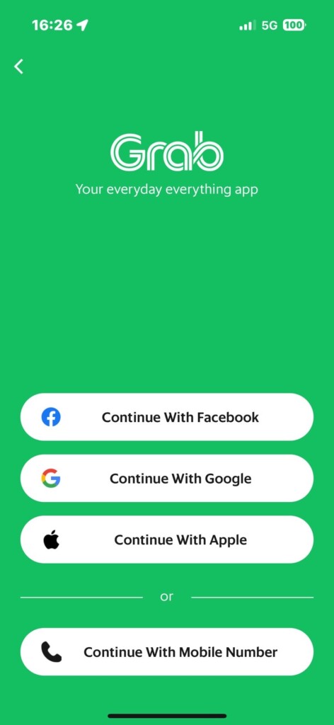 首先,請至您的手機應用程式商店下載 Grab。您可選擇使用 Facebook、Google、Apple 帳號快速登入,或使用當地手機號碼註冊。