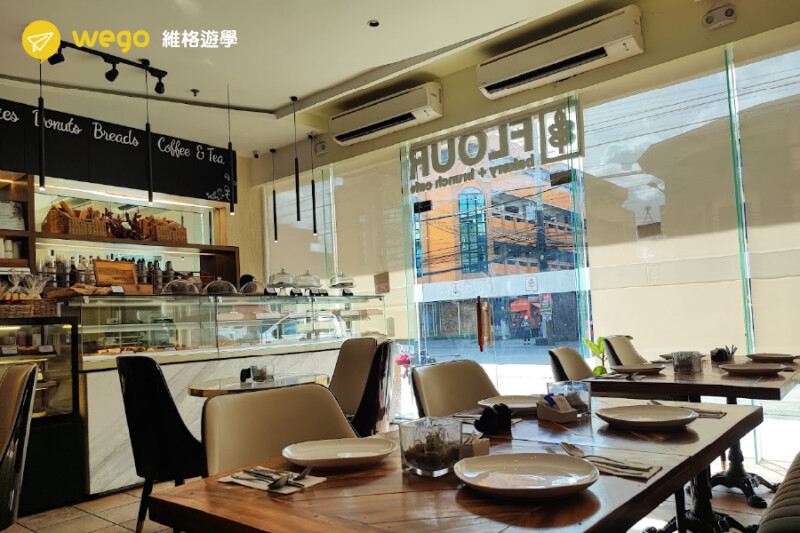 來到怡朗,怎能不提美食?Nora 強烈推薦一家當地評價極高的早午餐咖啡廳——Flour Bakery + Brunch Cafe。這家店位於聖奧古斯丁大學(University of San Agustin)附近,是當地大學生與中產階級的最愛,Google 評論高達 4.6 顆星。