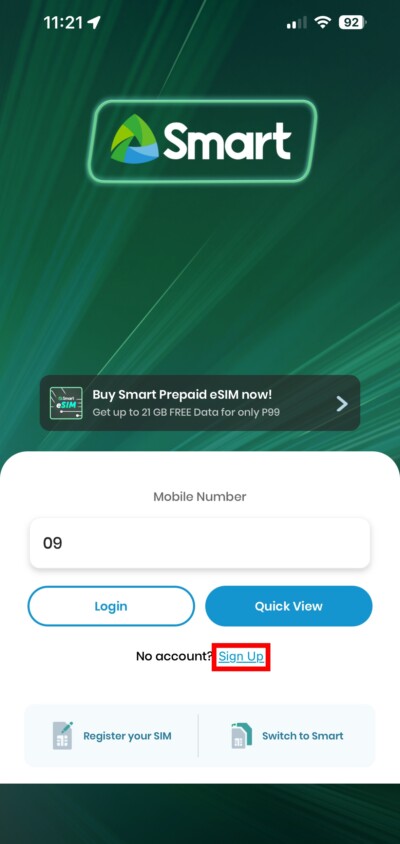 打開 SMART GigaLife APP,點選畫面中的 【Register your SIM now】,系統將自動跳轉至實名制網頁。若使用電腦,請點擊下方連結。