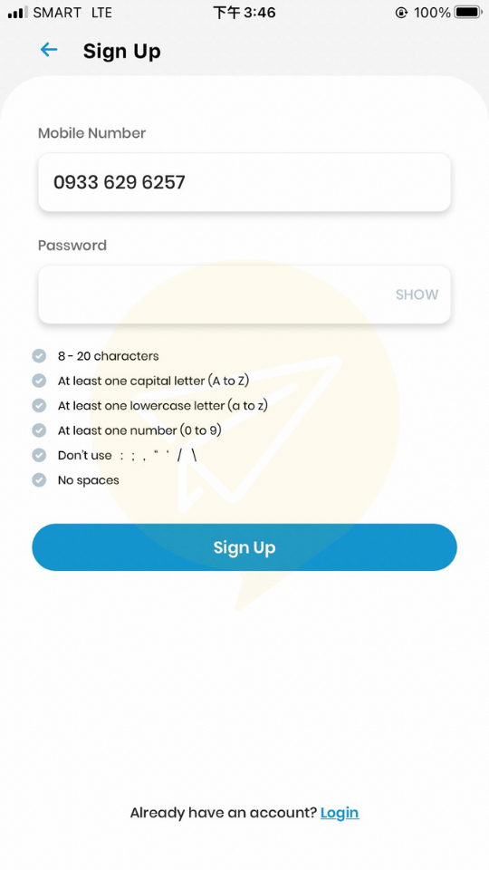 2. 設定帳號密碼:輸入您的菲律賓手機號碼並設定密碼 (至少8位數,含大小寫英文與數字),點擊 SIGN UP。