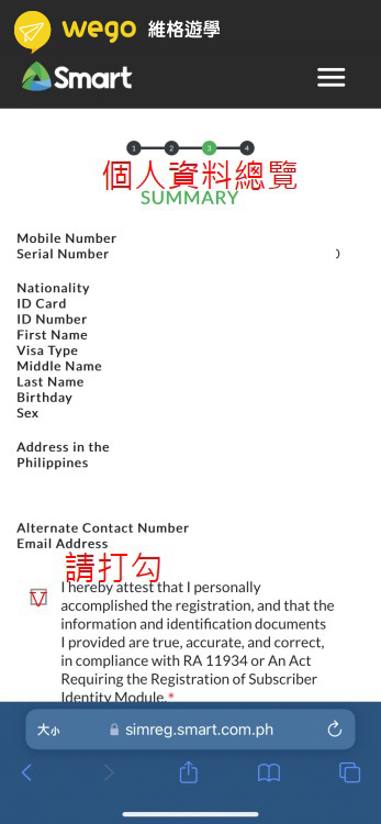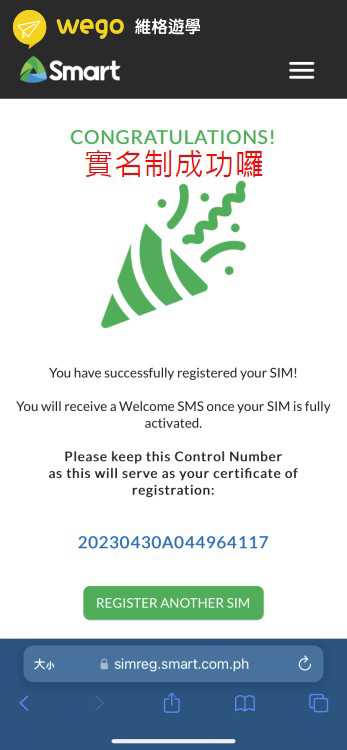 提交成功後,系統會顯示註冊完成。但这不代表門號已可使用,需等待菲律賓電信進行人工審核,通常需要 30 分鐘至 24 小時,甚至更久。
