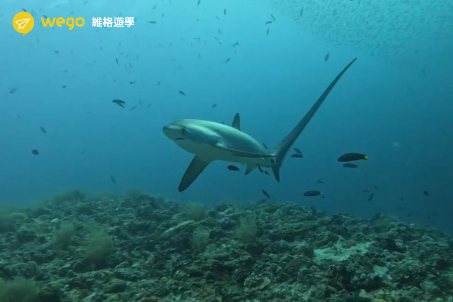 2025 更新資訊: 過去長尾鯊多出沒於深達30米的 Monad Shoal,但近年來牠們更常在較淺(約12-15米)的 Kimud Shoal 現身,光線更充足,不僅適合觀賞,也是水下攝影師的福音。