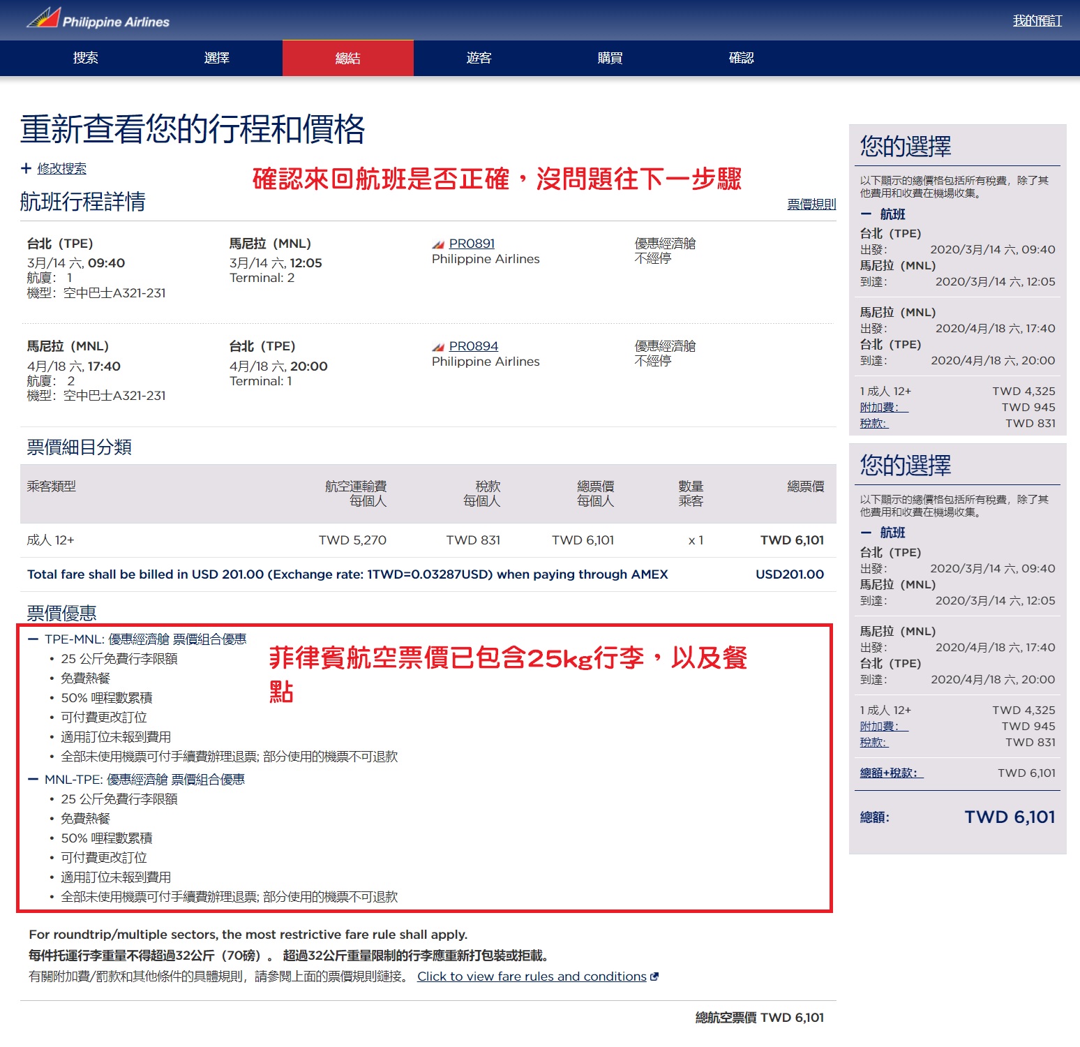 選定後,請務必再次確認「來回航班時間」與「總價格」是否正確。