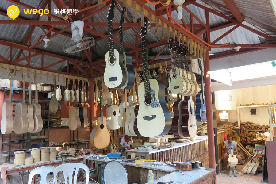 菲律賓的木吉他享譽全球,其製作過程需經過29道工序,並使用經過6年自然乾燥的木材,以確保音質與耐用度。音箱是吉他一個非常重要的元素。 一個吉他的好與壞很大程度取決於音箱的品質! 所以音箱的木材更是不容忽視,這裡的吉他木都是遠道由棉蘭老島和加拿大運來的上等木材,經計算後粗略切割出音箱的形狀,再將其細細打磨成為閃亮的木吉他。