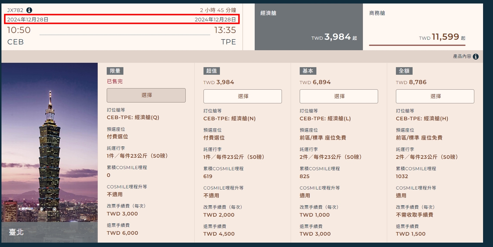 系統會列出可選的航班,您可以根據時間偏好選擇去程與回程班機。接著,為您的去回程各選擇一個票價方案。方案主要差異在於行李額度、里程累積、改票費用以及是否能免費選位,請依個人需求選擇最適合的組合。