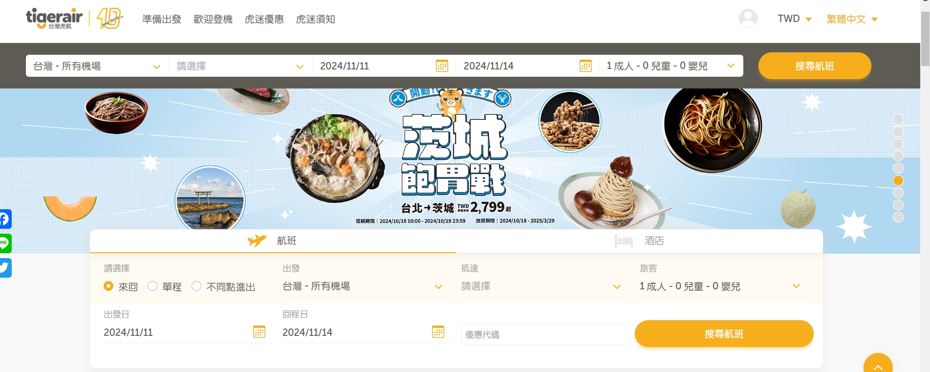Step.1 台灣虎航訂票-選擇出發地、目的地及日期