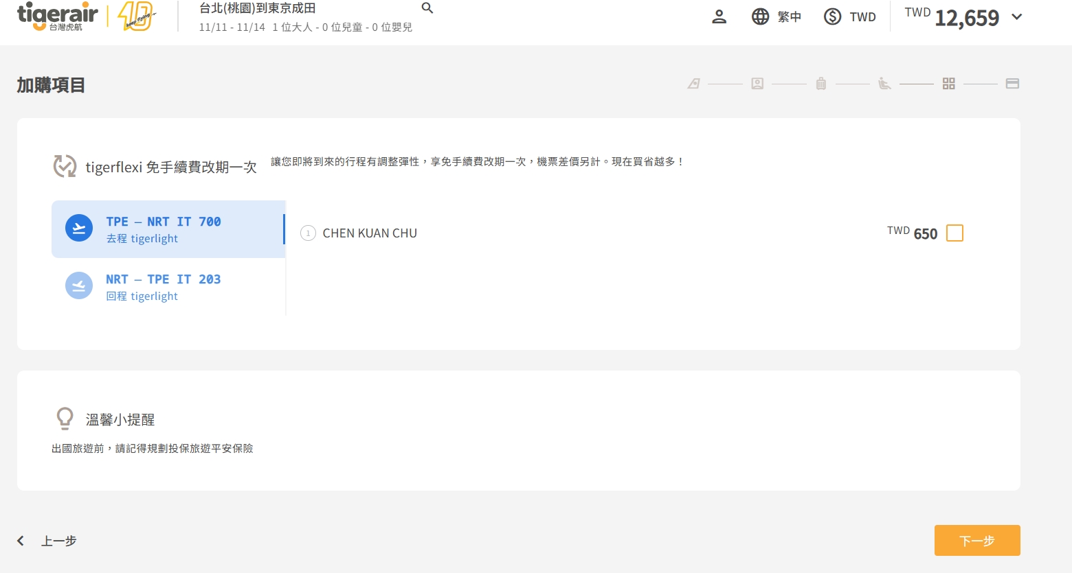 大家可以依照自己需求選擇是否要買虎航的package,那如果都不需要的話也可以直接跳選下一步,後面還可以加選行李跟附加服務