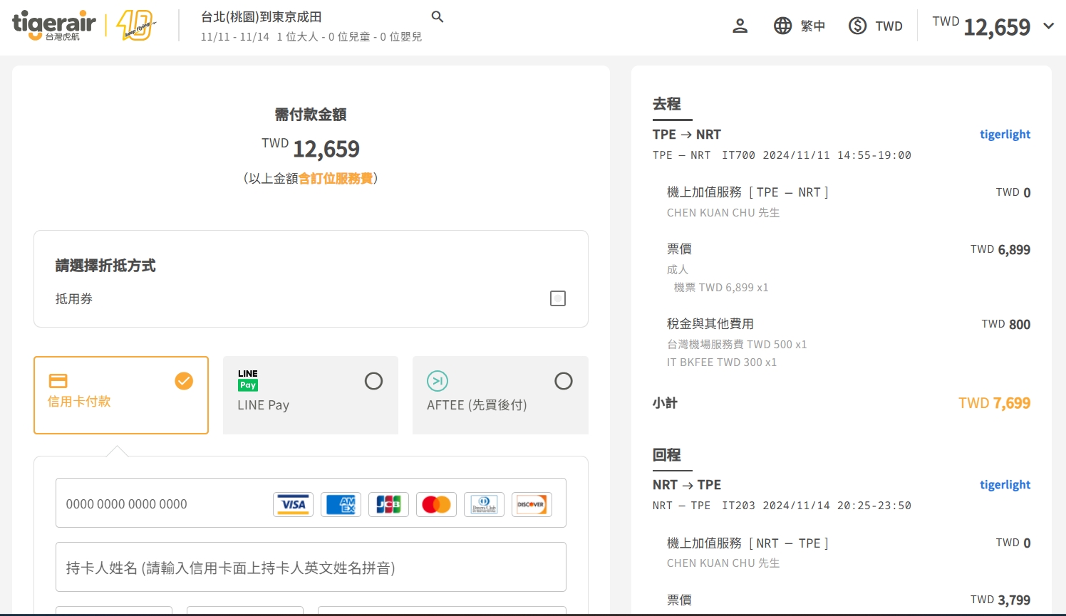 最後一步驟填寫付款資訊,目前有三種支付方式,信用卡、LINE PAY、AFTEE,小編目前只有用過信用卡支付,其他二種方式如果有更新使用方式,繼續讓大家知道。
