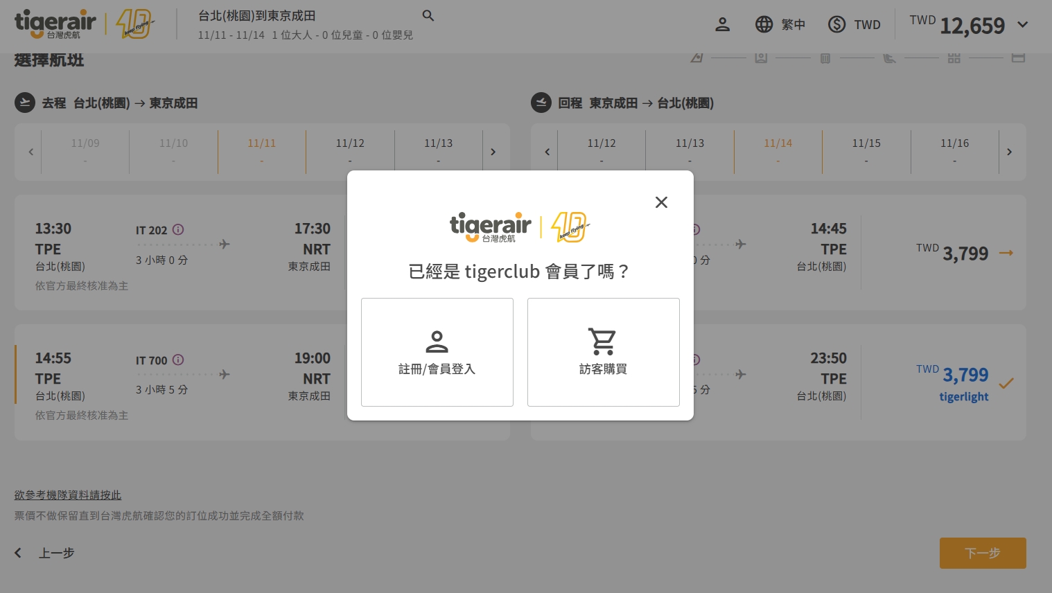Step.2 台灣虎航訂票-選擇購買的票類型、價格
