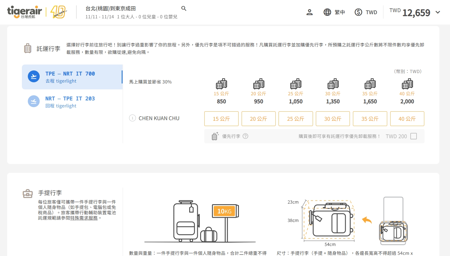 1.tigerlight:虎航最基本票,免費手提行李10KG(最多兩件),托運行李可至下一頁選購。